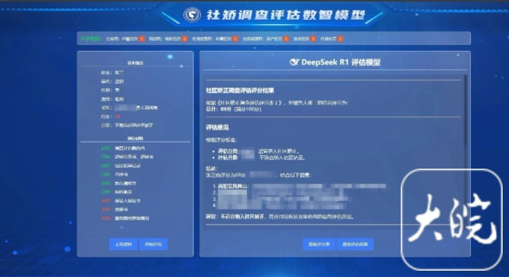 研发过程中,为提高调查评估数智化应用大模型的科学性、精准性,通过输入历史海量调查评估数据对DeepSeek应用大模型进行数据训练,强化逻辑推理能力。该应用大模型内嵌法律法规知识库和执法文书样本,对调查评估证据材料的完整性、证据链逻辑性以及程序合法性进行自动校验,并围绕量化指标对评估对象是否适宜纳入社区矫正进行智能评分,输出量化调查评估报告。
